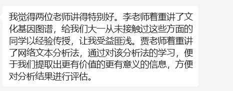 讲座结束后,24级文化产业管理学生王泽宇同学说道:“我觉得两位老师讲得特别好。李老师着重讲了文化基因图谱,给我们大一从未接触过这些方面的同学以经验传授,让我受益匪浅。贾老师着重讲了网络文本分析法,通过对该分析法的学习,便于我们提取出更有价值的更有意义的信息,方便对分析结果进行评估。” 相信同学们在学会这一方法后能够在旅游、文化产业研究中加以应用。