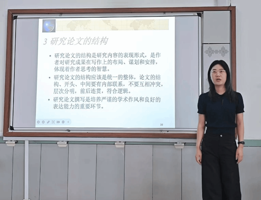 随后,李新越详细介绍了研究论文的常见类型,并系统讲解了论文的基本框架,包括题目、摘要、目录、导言、正文、结论、参考文献等组成部分的写作规范。她强调了论文题目应简洁具体,摘要需突出研究亮点,导言部分应明确研究目的和意义,正文内容需逻辑清晰、层次分明。此外,他还对参考文献的格式、图表的使用、语言表述的学术性等细节问题进行了细致说明。