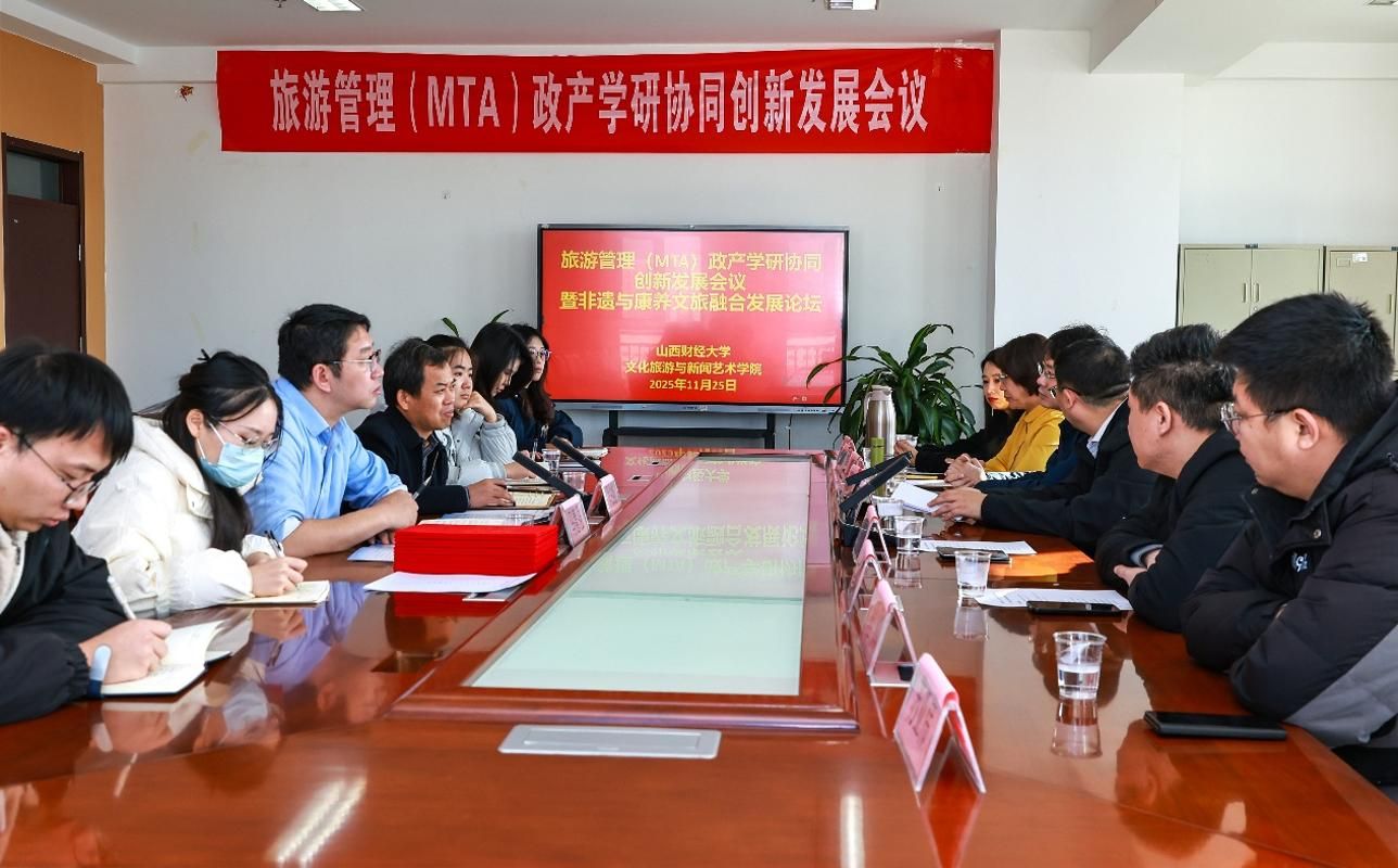 2025年11月25日,以“资源整合·跨界融合·创新提质”为主题的旅游管理(MTA)政产学研协同创新发展会议暨非遗与康养文旅融合发展论坛在山西财经大学文化旅游与新闻艺术学院成功举办。本次论坛汇聚了来自政府文旅部门、高校旅游管理学科专家、旅游重点企业、景区、非遗协会、康养机构等多位代表,共商旅游管理人才培养方案,共同探索深化政产学研协同创新机制,研究文旅康养融合发展路径,共绘旅游产业升级新蓝图。