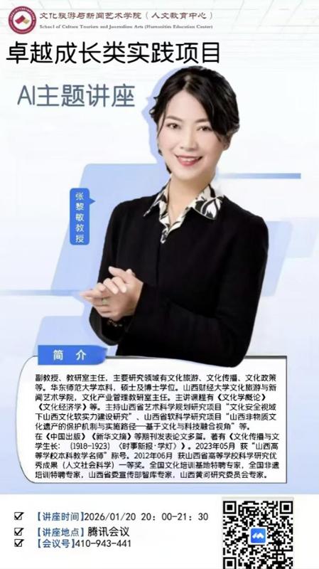 2026年1月20日晚20:00-21:30,山西财经大学文化旅游与新闻艺术学院文化产业管理专业成功举办“2025-2026学年第1学期小学期卓越成长类实践项目AI主题”线上专题讲座。本次讲座由学院文化产业管理教研室主任张黎敏老师主讲,教研室全体教师及2023、2024、2025级文化产业管理专业120余名本科生云端参会。她以“AIGC对文化创意的影响”为主题,为在场师生带来了一场前沿而深刻的分享。