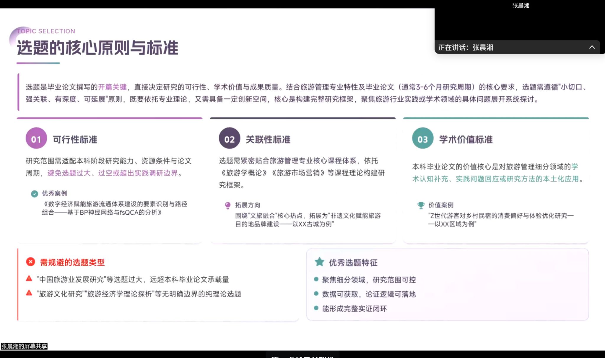 论文选题应聚焦细分领域,兼具专业性、实用性与学术严谨性,贴近旅游管理专业特点。她建议结合政策导向(如文旅融合)和课程学习基础,关注行业新趋势(如短视频传播、网红景区),并通过具体研究方法(如BP神经网络、fsQCA)实现研究的可控性和逻辑闭环,避免"文化研究"等过于宽泛、缺乏数据支撑的纯理论选题。选题确定后需与导师沟通校准,小范围选题便于后期灵活调整。